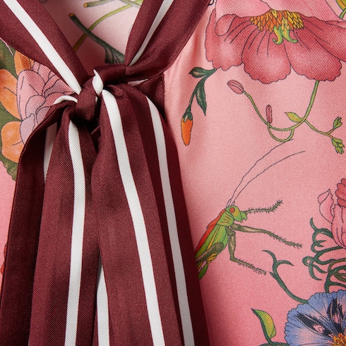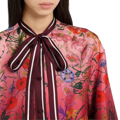 El estampado Flora de los diseños clásicos de los años 60 aporta un toque romántico a una selección de prendas ready-to-wear de colores y degradados innovadores de la colección Pre-Fall 2025. En esta camisa de sarga de seda con lazo anudable en el cuello, el motivo es más denso conforme se acerca al dobladillo.