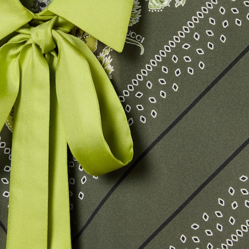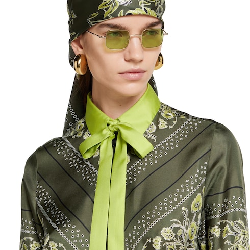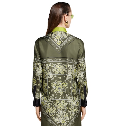 El verde es un color clave de la narrativa de la colección Pre-Fall 2025 y, junto con las texturas, los detalles de logotipo y las diferentes tonalidades, se convierte en una parte imprescindible de la temporada, tal como se ha visto en la pasarela. Esta camisa de sarga de seda se realza con un estampado de pañuelo floral por toda la superficie. Un elegante lazo anudado completa el diseño.