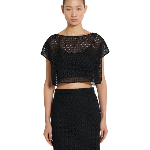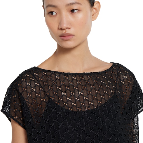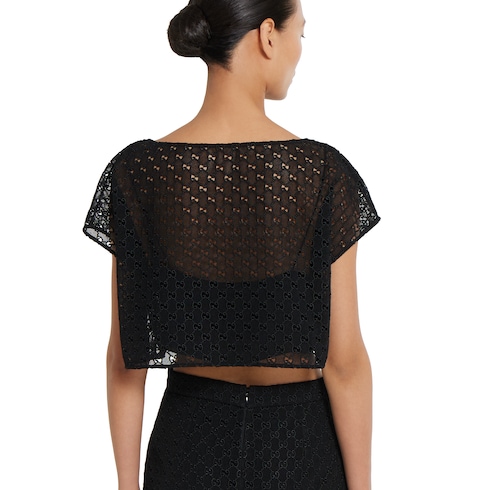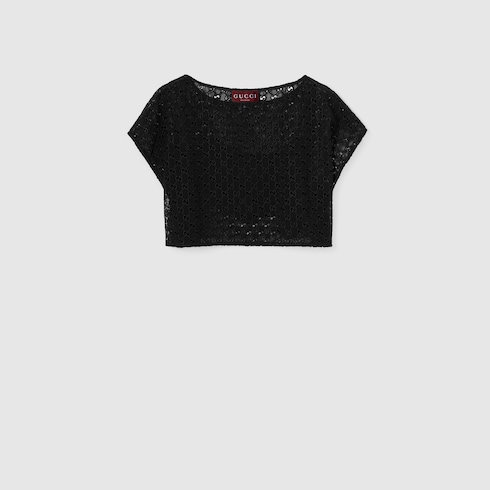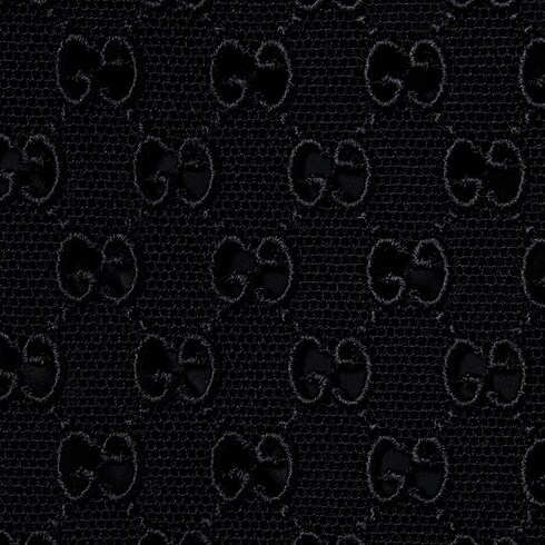 Una paleta monocromática con detalles sutiles, como bordados o apliques con logotipo, facilita la transición del día a la noche en una selección de prendas de la colección Pre-Fall 2025. Esta parte de arriba de ajuste corto destaca con una silueta de macramé de poliéster con GG.
