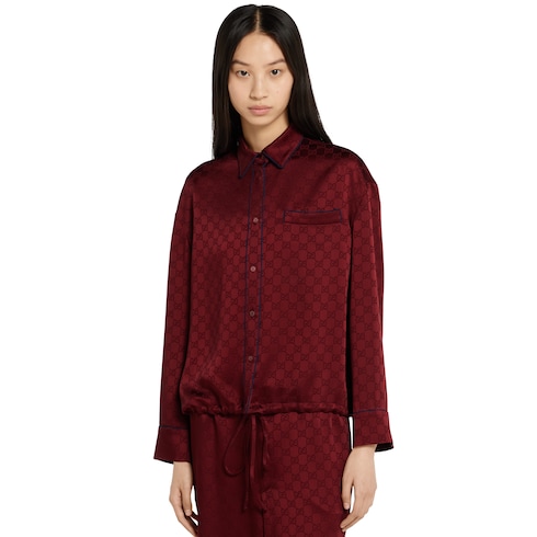 Las elegantes prendas con materiales refinados en tonos claros y profundos destacan con siluetas sensuales para elevar la colección Pre-Fall 2025. Esta camisa de satén con GG exhibe un ribete azul a juego.