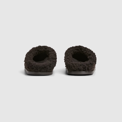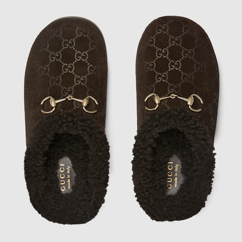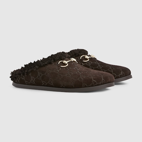 Estos mules para mujer, confeccionados en ante con GG, reinterpretan el legado de la Firma a través de una perspectiva contemporánea. El exclusivo detalle de Horsebit, con un acabado en tono dorado claro, añade un toque refinado al diseño.