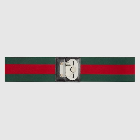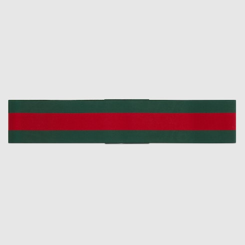 Con los colores clásicos de la tribanda Web de la Firma, esta correa para equipaje elástica verde y roja cuenta con un ribete de piel negra y cierre de mariposa. Se puede combinar con diferentes maletas Gucci como cierre adicional.