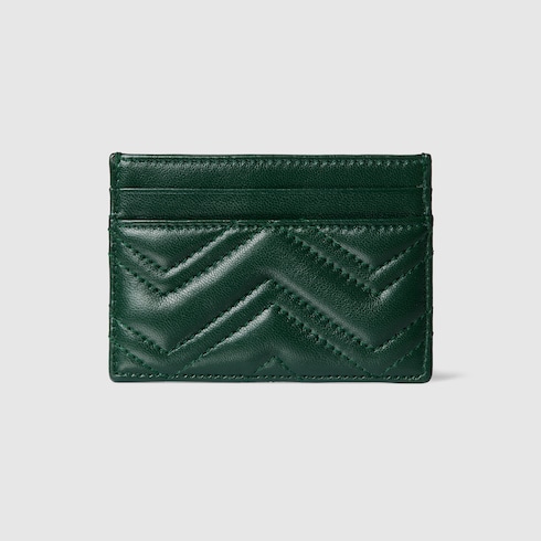 La línea GG Marmont presenta diseños versátiles con colores innovadores, como este tarjetero en piel matelassé verde con motivo chevron, que se remata con el aplique de Doble G en dorado claro.