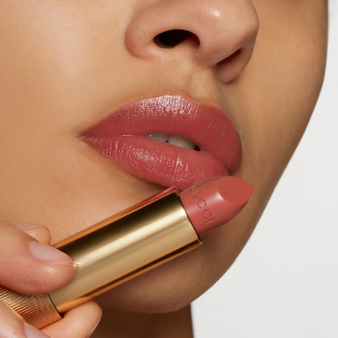 - Clin d’œil aux produits de maquillage vintage, le rouge à lèvres est présenté dans un précieux écrin doré orné d’un capuchon ivoire à effet laqué avec imprimé boutons de rose rappelant la porcelaine.