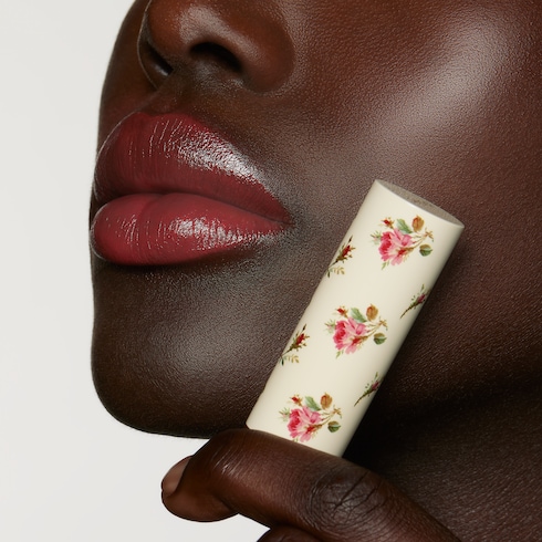 - Clin d’œil aux produits de maquillage vintage, le rouge à lèvres est présenté dans un précieux écrin doré orné d’un capuchon ivoire à effet laqué avec imprimé boutons de rose rappelant la porcelaine.