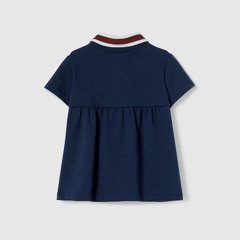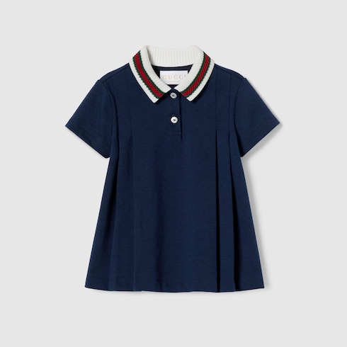 La bande Web issue des archives est omniprésente dans la collection Pre-Fall 2025 pour enfant, dans différentes versions. Les finitions coloris vert et rouge sur les pièces de prêt-à-porter, les chaussures et les accessoires donnent une allure sportive, adaptée à chaque aventure. Cette robe pour bébé confectionnée en jersey de coton épais présente un col polo en maille avec bande Web.