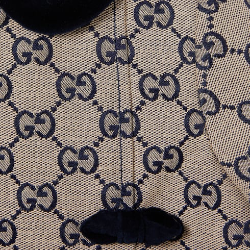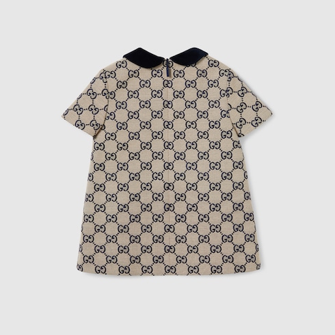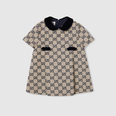 Des broderies subtiles aux imprimés sur toute la surface, les motifs emblématiques continuent d’enrichir la collection Pre-Fall 2025 pour enfant. Cette robe pour bébé confectionnée en toile GG en référence au motif monogrammé instantanément reconnaissable de la Maison présente un col en velours contrastant.