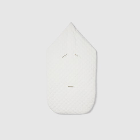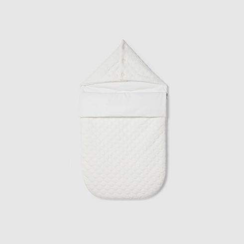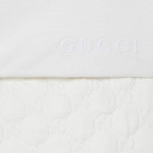 From prints to embroidered details, the House name and logo appears in various forms on a selection of ready-to-wear and accessories for Pre-Fall 2025. This baby nest has been made from padded GG jersey with a Gucci embroidery.