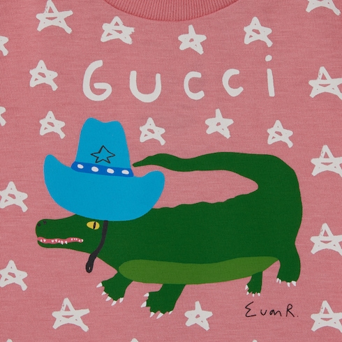 Euan Roberts, artiste basé au Royaume-Uni, vise à transmettre de l’humour, de l’espoir et de la joie à travers une gamme éclectique de personnages animaliers et de métaphores visuelles. Dans le cadre de la collection Pre-Fall 2025 pour enfant, des motifs exclusifs agrémentent des pièces de prêt-à-porter, des accessoires souples et des articles de maroquinerie aux côtés du logo Gucci.