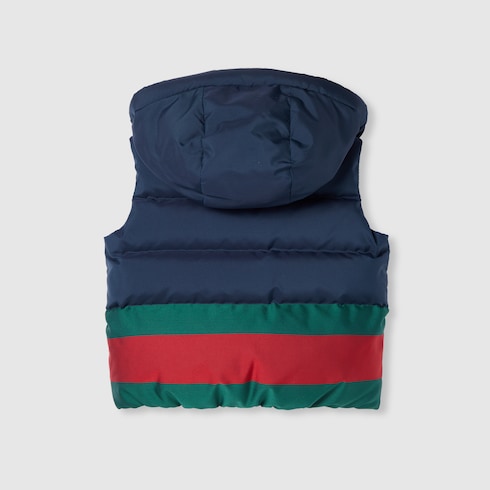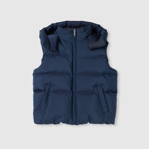 Des imprimés aux détails brodés, le nom et le logo de la Maison s’affichent sous différentes esthétiques sur une sélection de pièces de prêt-à-porter et d’accessoires pour la collection Pre-Fall 2025. Ce gilet pour enfant est confectionné en nylon matelassé et rehaussé d’un détail bande Web.