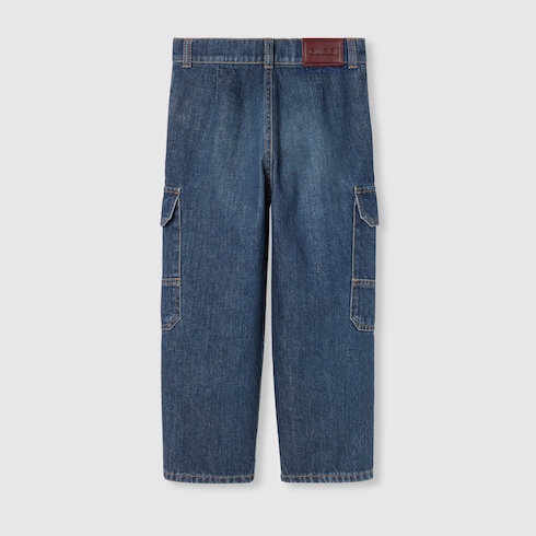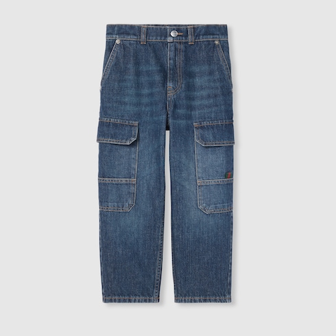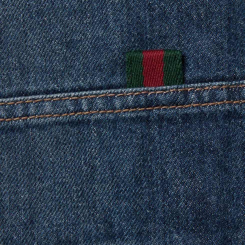 La bande Web issue des archives apparaît dans l’ensemble de la nouvelle collection enfant dans différentes versions. Les finitions coloris vert et rouge sur les pièces de prêt-à-porter, les chaussures et les accessoires donnent une allure sportive, adaptée à chaque aventure. Ce pantalon pour enfant confectionné en denim présente un passant orné de la bande Web et une étiquette en cuir embossée du logo Gucci.