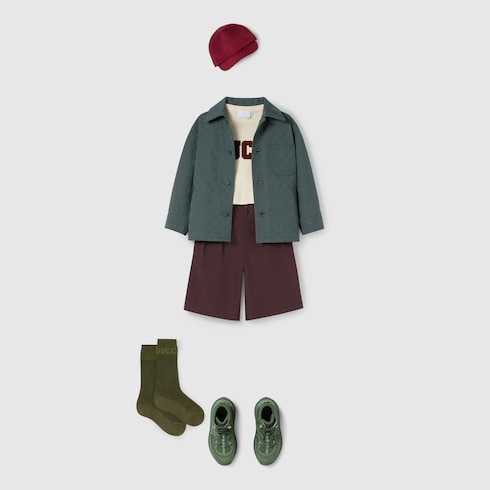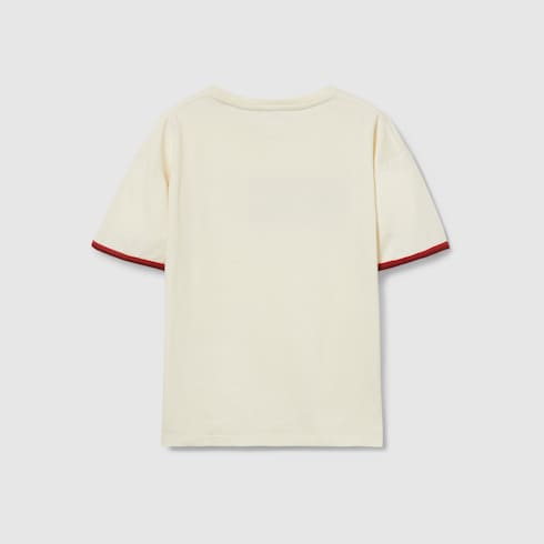 Des broderies subtiles aux imprimés sur toute la surface, les motifs emblématiques continuent d’enrichir la collection Pre-Fall 2025 pour enfant. Ce t-shirt pour enfant confectionné dans un jersey de coton doux est agrémenté d’un empiècement Gucci et d’une finition contrastante.