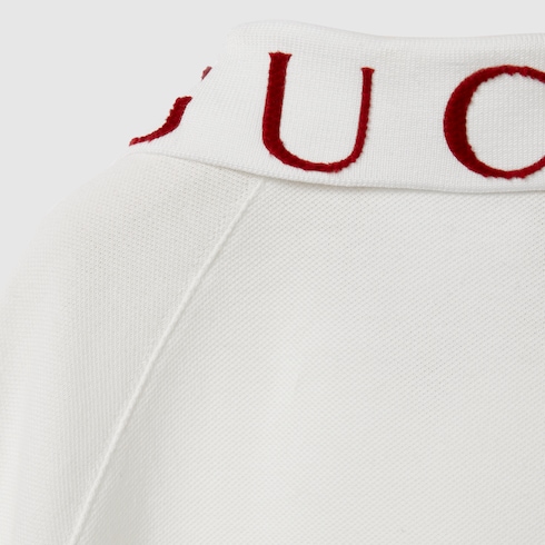 La collection de vêtements pour enfants de la Maison continue de revisiter ses codes emblématiques, mêlant matériaux somptueux, artisanat d’exception et teintes contemporaines. Ce polo confectionné en piqué de coton stretch pour enfant est orné d’une broderie Gucci texturée sur le col.