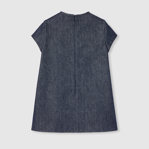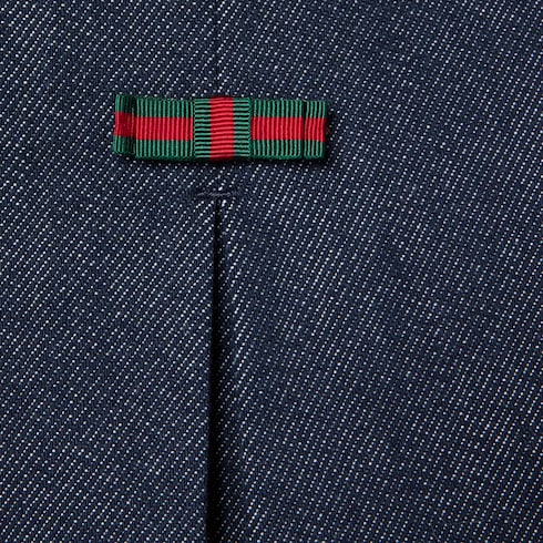 La bande Web issue des archives est omniprésente dans la collection Pre-Fall 2025 pour enfant, dans différentes versions. Les finitions coloris vert et rouge sur les pièces de prêt-à-porter, les chaussures et les accessoires donnent une allure sportive, adaptée à chaque aventure. Cette robe pour enfant confectionnée en denim est ornée d’un détail nœud avec bande Web.