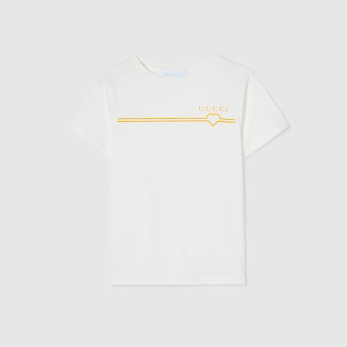 Des broderies subtiles aux imprimés sur toute la surface, les motifs emblématiques continuent d’enrichir la collection Pre-Fall 2025 pour enfant. Ce t-shirt pour enfant confectionné en jersey de coton est agrémenté d’une broderie cœur Gucci.