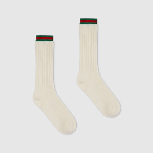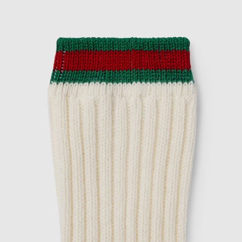 La bande Web issue des archives apparaît dans l’ensemble de la nouvelle collection enfant dans différentes versions. Les finitions coloris vert et rouge sur les pièces de prêt-à-porter, les chaussures et les accessoires donnent une allure sportive, adaptée à chaque aventure. Ces chaussettes pour enfant confectionnées en maille de coton présentent une finition à bande Web contrastée.