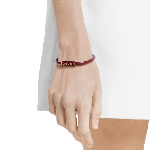 Présentés dans la gamme de bijoux tendance de la collection Pre-Fall 2025, les bracelets en cuir affichent une silhouette tubulaire et arborent un détail émaillé ton sur ton gravé du logo Gucci. Des éléments dorés et un fermoir orné d’un détail GG enlacés rond viennent compléter le modèle. Cette variante est déclinée en cuir rouge Rosso Ancora.