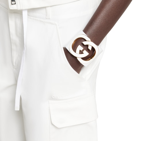 La sélection Gucci Interlocking s’enrichit de larges bracelets-manchette en résine avec détail GG enlacés ajouré en émail ton sur ton. Cet accessoire fait écho à la palette de couleurs qui annonce la collection de prêt-à-porter Pre-Fall 2025.