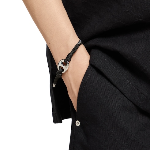 L’univers nautique s’étend à l’offre de bijoux Gucci pour la collection Pre-Fall 2025 avec des bracelets en corde de différentes couleurs et finitions arborant la breloque Marina Chain. Associez cet accessoire à d’autres bracelets, comme cela a été fait lors du défilé. Cette variante est en tissu noir.