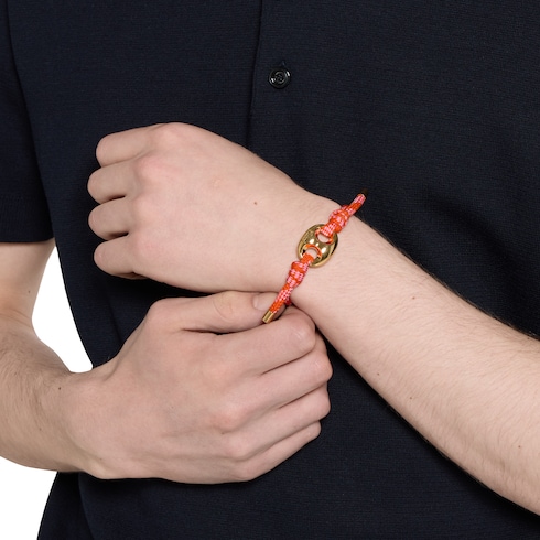 L’univers nautique s’étend à l’offre de bijoux Gucci pour la collection Pre-Fall 2025 avec des bracelets en corde de différentes couleurs et finitions arborant la breloque Marina Chain. Associez cet accessoire à d’autres bracelets, comme cela a été fait lors du défilé. Cette variante est disponible en tissu orange et multicolore.
