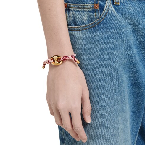 L’univers nautique s’étend à l’offre de bijoux Gucci pour la collection Pre-Fall 2025 avec des bracelets en corde de différentes couleurs et finitions arborant la breloque Marina Chain. Associez cet accessoire à d’autres bracelets, comme cela a été fait lors du défilé. Cette variante est en tissu rose et multicolore.
