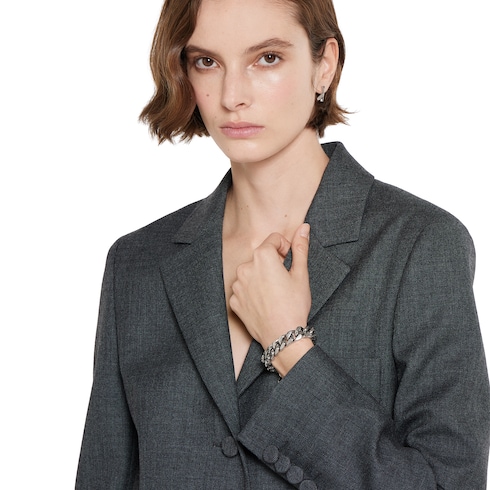 Pour la collection Pre-Fall 2025, la gamme Gucci Signature se caractérise par un logo audacieux, que l’on retrouve sur des colliers chaînes argentés et des boucles d’oreilles arborant un motif GG sur toute la surface. Ce bracelet est orné du logo gravé sur la chaîne gourmette.