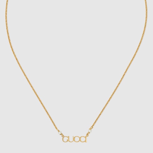 L’inscription Gucci, présentée en trois dimensions, affirme son style sculptural. La collection de bijoux tendance, disponible dans les tons or jaune et or rose, comprend des bracelets, des colliers, des boucles d’oreilles individuelles et des chevalières. Ce collier en métal couleur or est orné du logo Gucci sculpté.