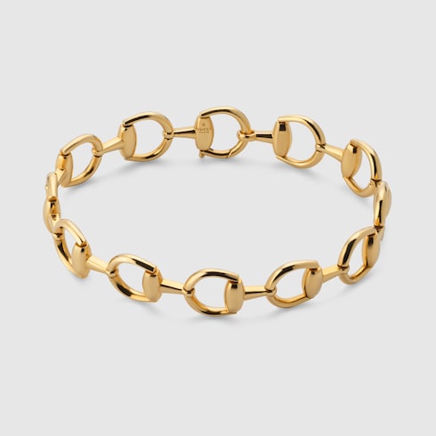 Gucci célèbre le 20e anniversaire de la gamme de bijoux Horsebit emblématique avec des pièces classiques et iconiques en or jaune 18 carats. Ce bracelet se caractérise par des motifs Mors connectés.