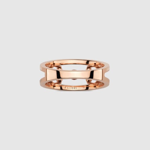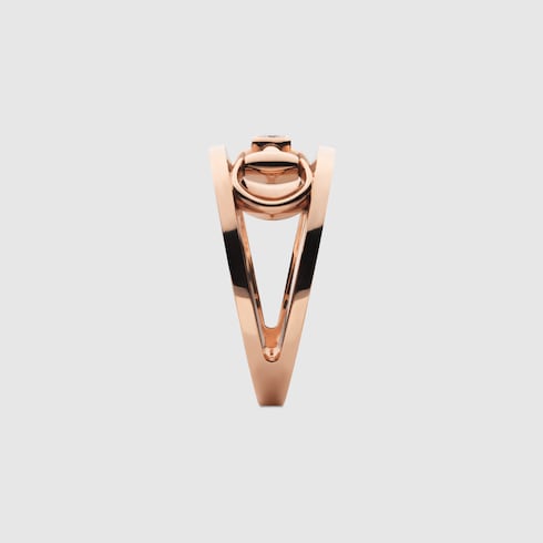 Gucci célèbre le 20e anniversaire de la gamme de bijoux Horsebit emblématique avec des pièces classiques et iconiques en or rose 18 carats avec diamants. Cette large bague à détail Mors est rehaussée d’un diamant blanc étincelant au centre.