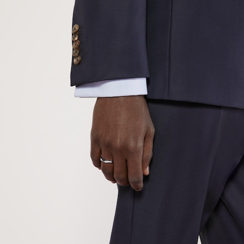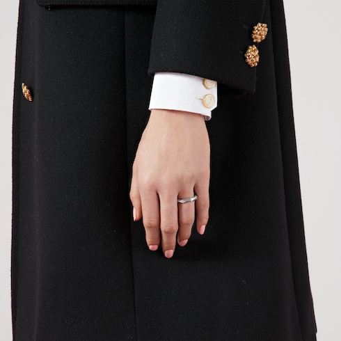 La collection Gucci Link to Love explore le romantisme moderne à l’origine des nouveaux symboles de l’amour. Elle associe différentes teintes dorées à une alliance de finitions éliminant la frontière entre masculin et féminin. Chaque pièce est conçue afin de donner à chacun l’inspiration pour la porter à sa façon, avec des éléments parfaits pour jouer la carte de la superposition. Cette bague cloutée en or blanc 18 carats est dotée d’un mécanisme permettant de la superposer.