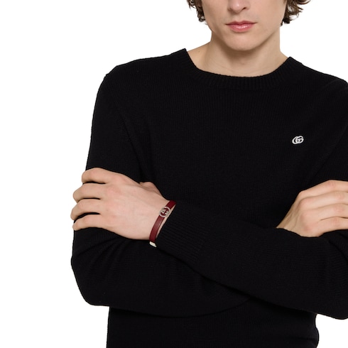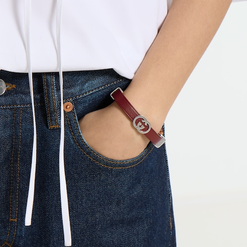 Ces bracelets en cuir raffinés, qui font partie de la collection Gucci Interlocking pour la collection Pre-Fall 2025, arborent un détail GG enlacés en argent. Cette version en cuir lisse rouge Rosso Ancora est dotée d’une fermeture coulissante facile d’utilisation.
