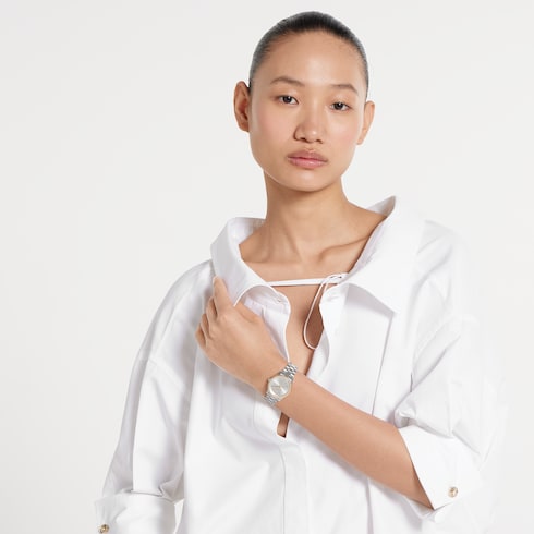 Pour les dernières collections, la gamme G-Timeless est réinventée avec de nouveaux coloris, mettant en valeur les motifs signature de la Maison. Cette montre est dotée d’un bracelet en acier inoxydable, d’une lunette en or rose et d’un cadran argenté.