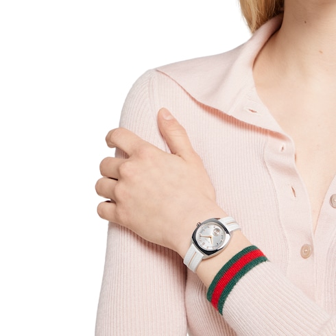 Les montres Gucci sont fabriquées dans des matériaux sélectionnés avec la plus grande attention. Pour garantir la longévité du produit, veuillez le traiter avec soin.