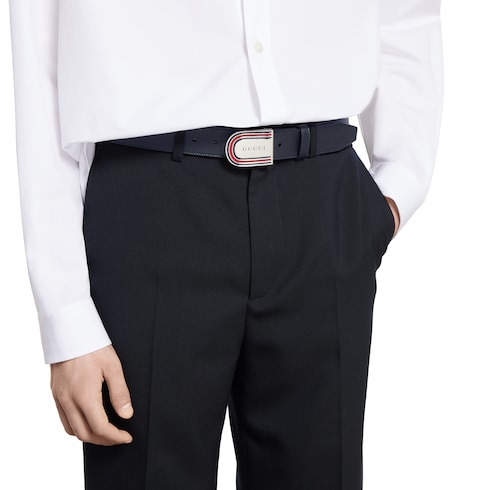 Les ceintures pour homme sont dotées de boucles plates à bords arrondis et d’un détail bande Web en émail. Ici, la boucle est présentée dans une teinte palladiée sur du cuir lisse bleu foncé.