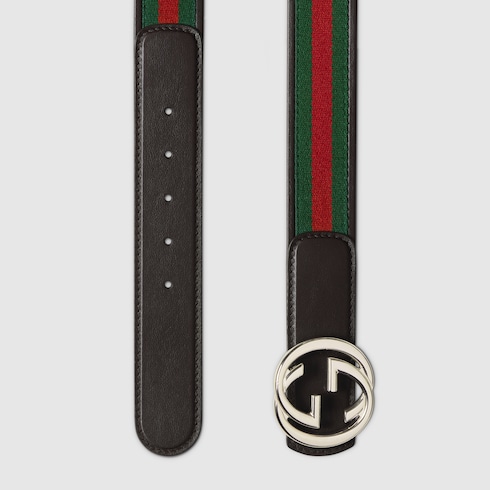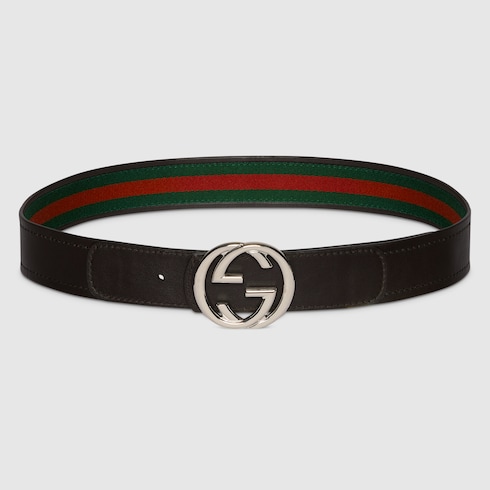 Pour la collection Automne-Hiver 2025, cette ceinture réversible marie toile bande Web vert et rouge et cuir marron foncé et se pare d’une boucle GG amovible.