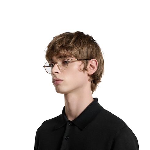 La collection de lunettes Pre-Fall 2025 présente des silhouettes élégantes avec la bande Web emblématique au niveau des branches. Cette monture optique ronde est confectionnée en métal doré clair et arbore un détail bande Web, un logo Gucci gravé et des embouts couleur écaille de tortue marron foncé.