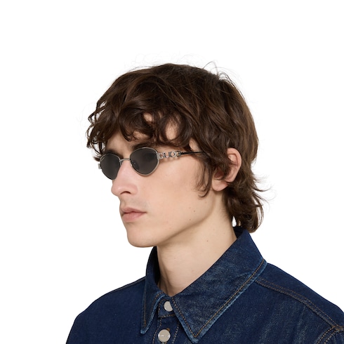 La collection de lunettes Pre-Fall 2025 associe des silhouettes originales issues des archives à une touche contemporaine. Confectionnées en métal coloris ruthénium clair, ces lunettes de soleil à monture ovale arborent un détail logo Gucci ajouré.