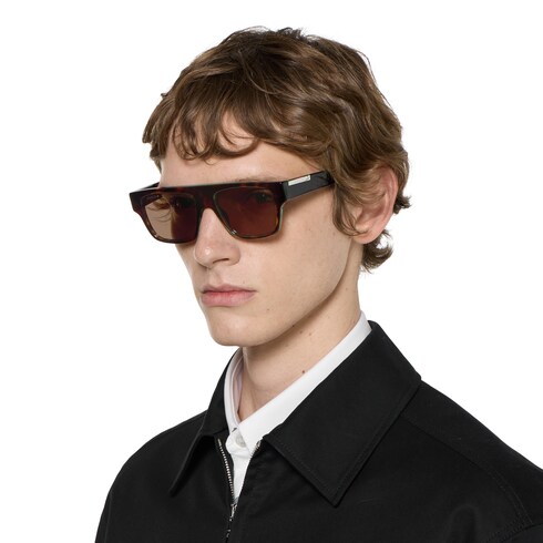 La collection de lunettes Pre-Fall 2025 présente des silhouettes élégantes avec la bande Web emblématique au niveau des branches. Confectionnées en acétate couleur écaille de tortue foncée, ces lunettes de soleil rectangulaires sont ornées d’un détail bande Web et d’un logo Gucci gravé sur une plaque en métal au niveau des branches.