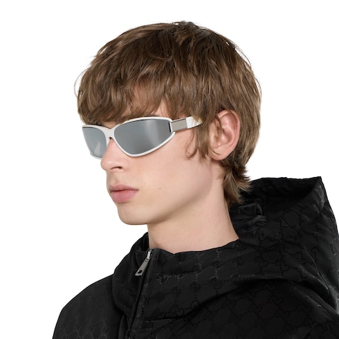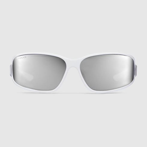 La collection de lunettes associe silhouettes épurées et motifs emblématiques sur des modèles modernes. Ces lunettes de soleil rectangulaires sont ornées d’un logo Gucci gravé sur une plaque métallique au niveau des branches injectées coloris blanc.