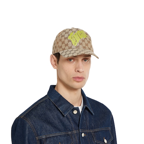 Pour la collection Pre-Fall 2025, l’artiste chinois Currynew (Xiang Zhang) revisite le logo de la Maison sur des pièces de prêt-à-porter, des articles de maroquinerie et des accessoires pour homme. Confectionnée en toile GG, cette casquette de baseball est rehaussée d’un imprimé Gucci.