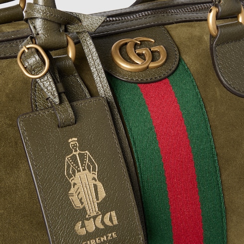 Pour la collection Automne-Hiver 2025, le Gucci Savoy associe daim et finitions en cuir pour allier texture et profondeur. Orné de la bande Web emblématique de la Maison et du détail Double G, ce sac de voyage incarne l’élégance intemporelle à travers des matériaux d’exception.
