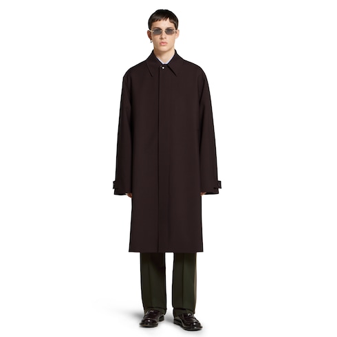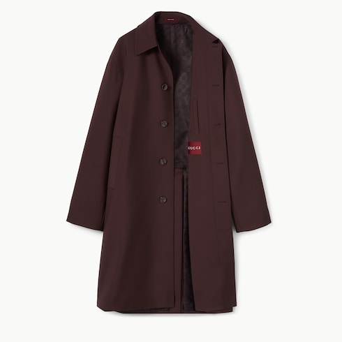 Des teintes automnales et des détails emblématiques de la Maison caractérisent une sélection de pièces habillées. C’est l’alliance parfaite entre élégance intemporelle et allure moderne, avec une attention particulière portée à la précision des lignes et à la décontraction des coupes. Confectionné en laine contrecollée bordeaux foncé, ce manteau est rehaussé d’un logo Gucci en relief sous le col et d’une doublure GG.