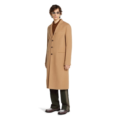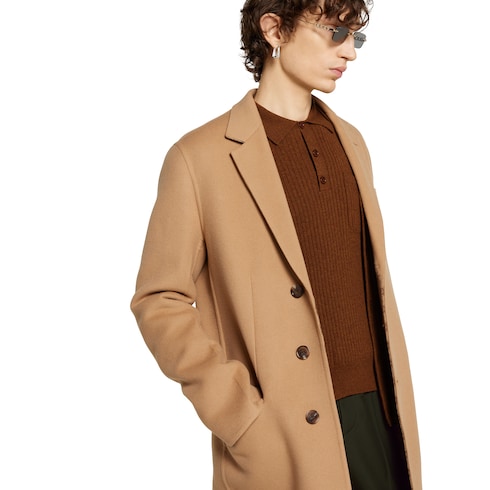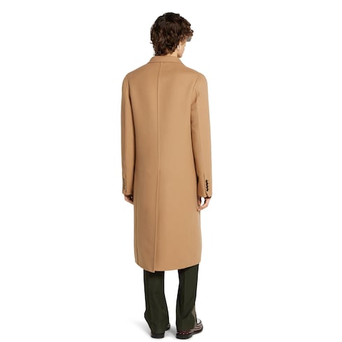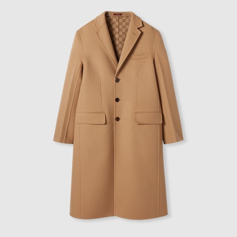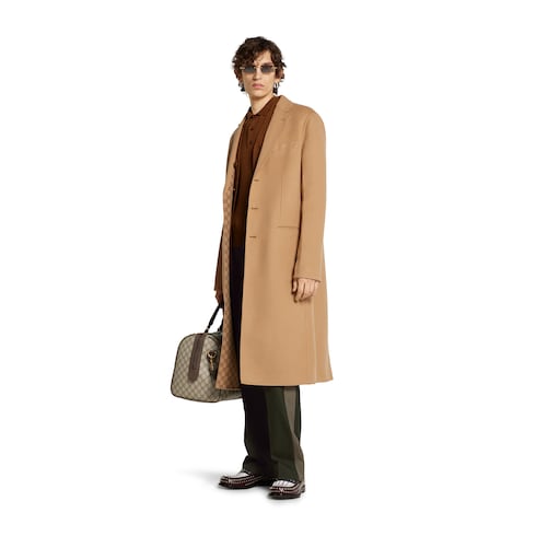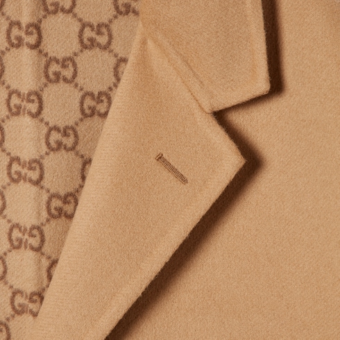 Des teintes automnales et des détails emblématiques de la Maison caractérisent une sélection de pièces habillées. C’est l’alliance parfaite entre élégance intemporelle et allure moderne, avec une attention particulière portée à la précision des lignes et à la décontraction des coupes. Confectionné en laine double camel et marron, ce manteau à simple boutonnage révèle un motif GG à l’intérieur.