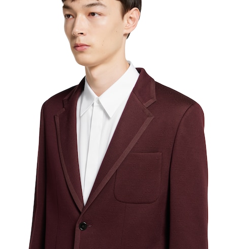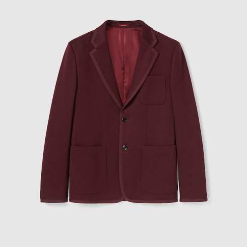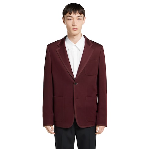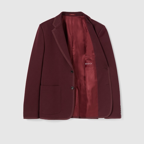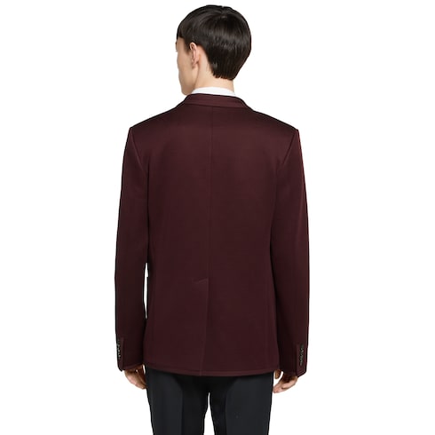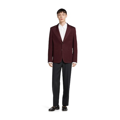 Des teintes automnales et des détails emblématiques de la Maison caractérisent une sélection de pièces habillées. C’est l’alliance parfaite entre élégance intemporelle et allure moderne, avec une attention particulière portée à la précision des lignes et à la décontraction des coupes. Confectionnée en jersey GG texturé bordeaux, cette veste à simple boutonnage est rehaussée de finitions en gros-grain.