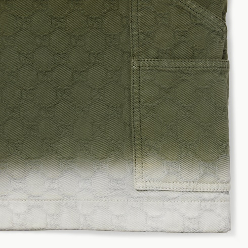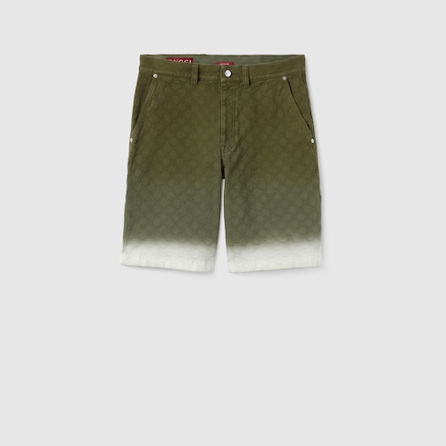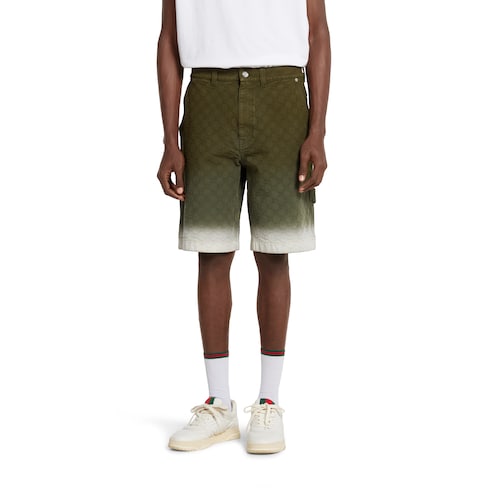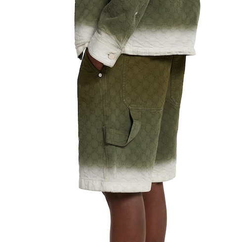 Le dégradé de couleurs est réalisé avec soin pour mettre en valeur la texture des matériaux et le motif GG emblématique. Ce short est confectionné en jacquard de denim GG en coton délavé, avec un dégradé de vert forêt à blanc.