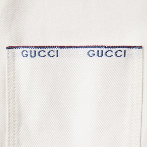 Les pièces du quotidien sont rehaussées de la lisière Gucci ou de l’imprimé logo vintage Gucci pour une allure urbaine. Confectionnée en denim de coton blanc, cette pièce se caractérise par des boutons en métal Gucci et un détail lisière Gucci.