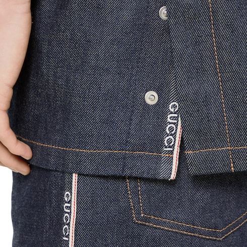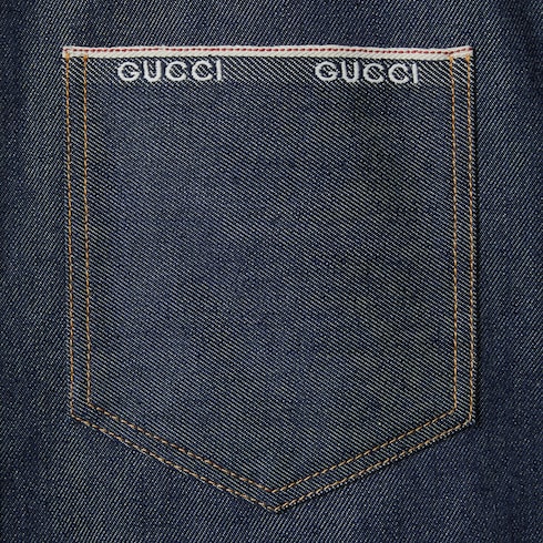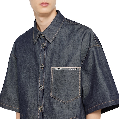 Les pièces du quotidien sont rehaussées du liseré Gucci ou de l’imprimé logo vintage Gucci pour une allure urbaine. Confectionnée en denim à liseré en coton bleu foncé, cette chemise se caractérise par des détails liseré Gucci emblématiques et des boutons métallisés Gucci.