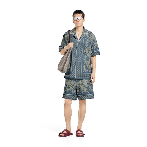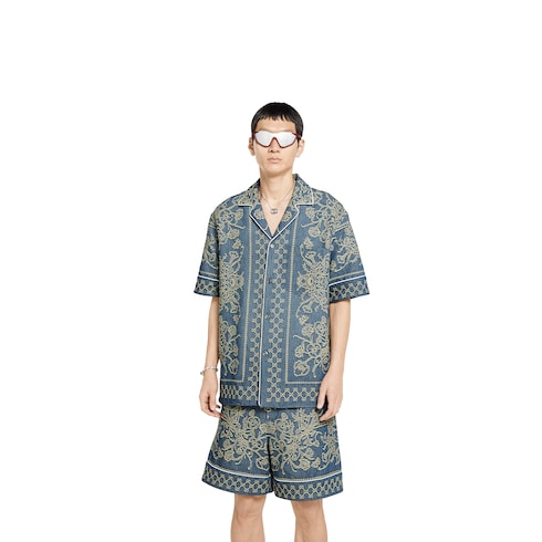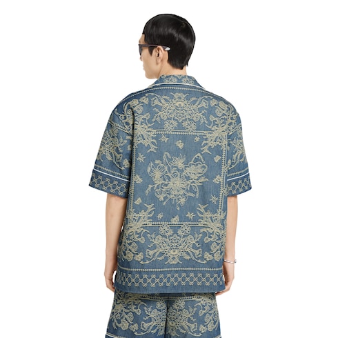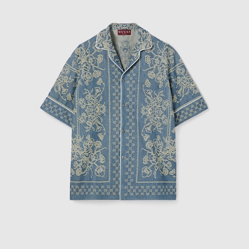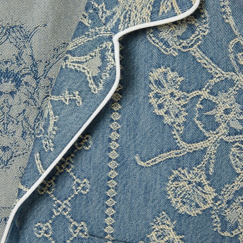 Dans la collection Pre-Fall 2025, les pièces en denim aux détails subtils rehaussent les looks du quotidien. Confectionnée en jacquard GG fleuri en denim délavé bleu et ivoire, cette chemise est agrémentée de boutons métallisés Gucci.