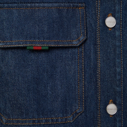 La collection Pre-Fall présente des pièces en denim aux détails subtils qui subliment les looks du quotidien. Cette chemise confectionnée en denim de coton se caractérise par un détail boucle bande Web vert et rouge sur la poche.