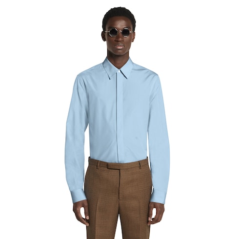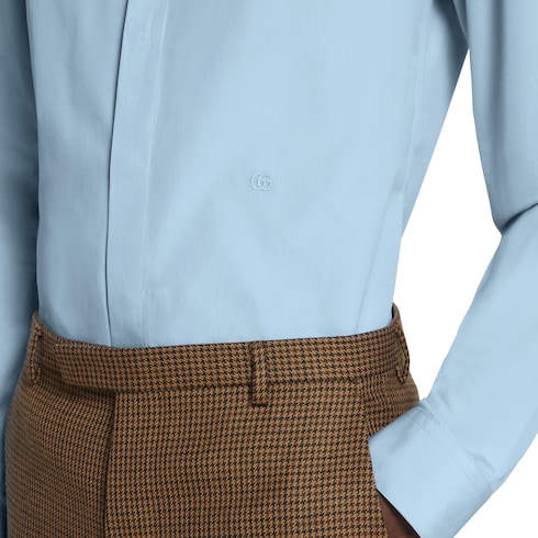 Pour la collection Pre-Fall 2025, une approche décontractée des tenues habillées voit l’arrivée de nouvelles silhouettes et coupes. Des éléments signature sont associés à des détails raffinés. Cette chemise en popeline de coton bleu clair est ornée d’une broderie Double G.